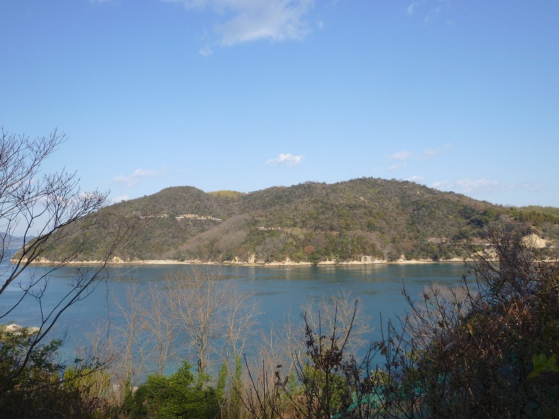 灯台は大三島の上浦町、海峡の向こう側は伯方島の伊方。薄く見える山は岩城島の積善山。