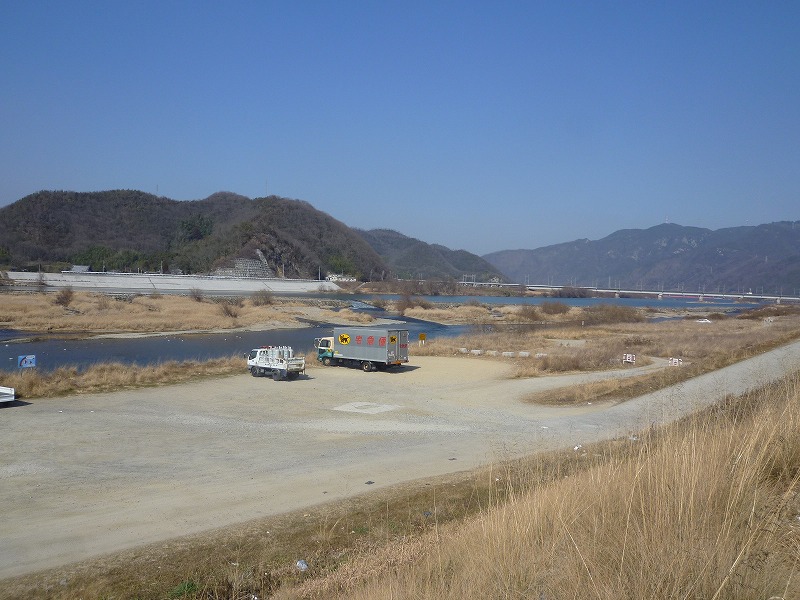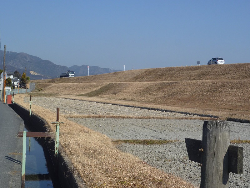 あの川岸がコンクリートで白く見えること、あの辺が吉井水門になるはず、なんだけどな。