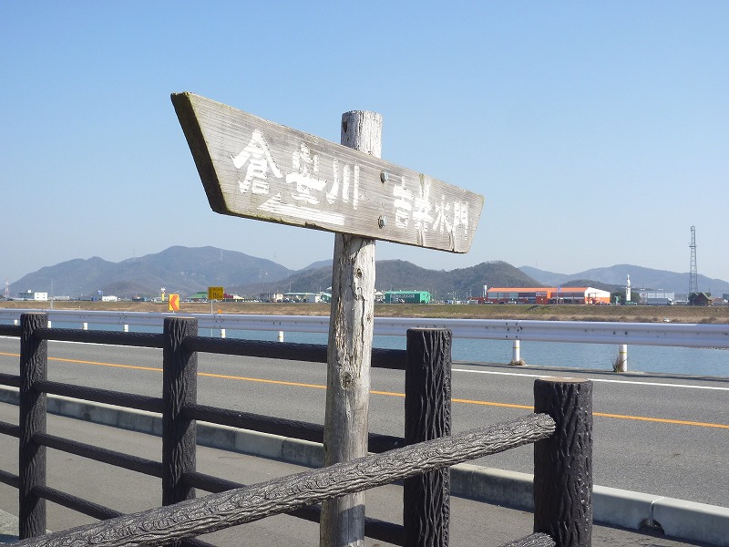 写真右の丸太に板、これが倉安川吉井水門の(今日見た最初の)標識。