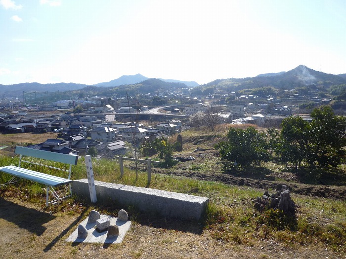 記念碑前から見る里庄町役場や里庄中学校。
