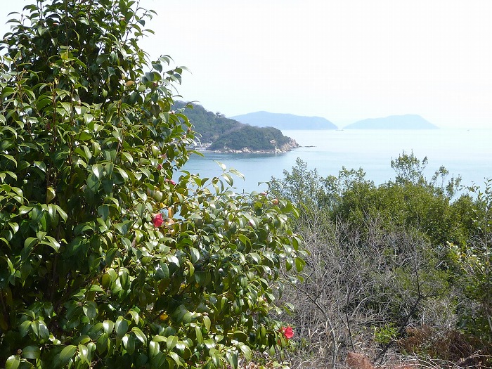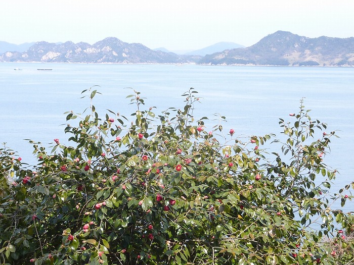 尻替の道路に沿って「やぶつばき」を植えてある。水仙も満開。