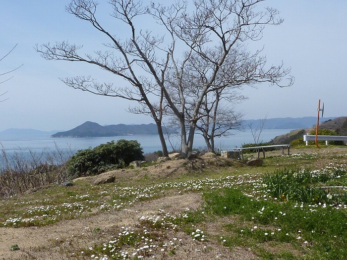 畑にエンドウが咲き、海には六島が浮かぶ。
