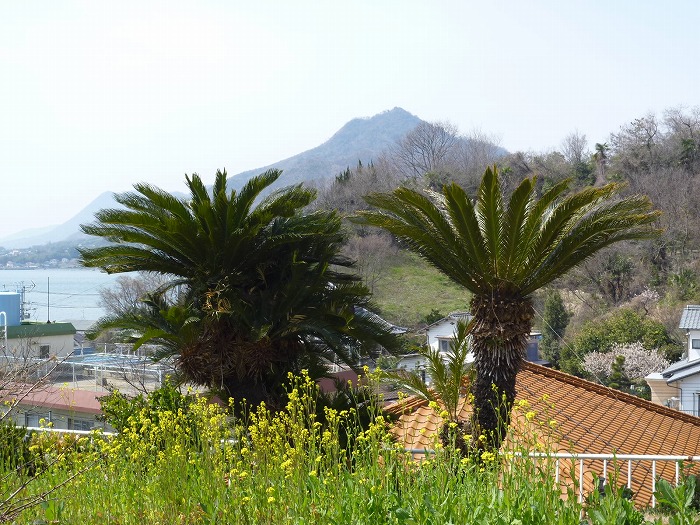 右手には内海造船、歩道には菜の花。