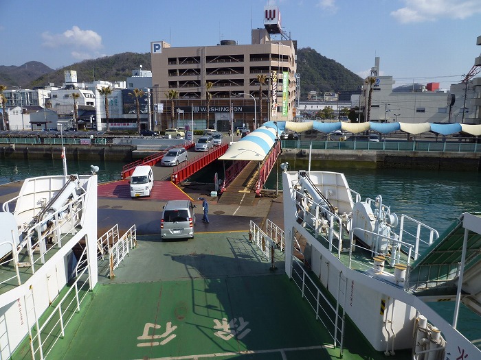車は桟橋のうえで方向転換してバックでフェリーに乗る。