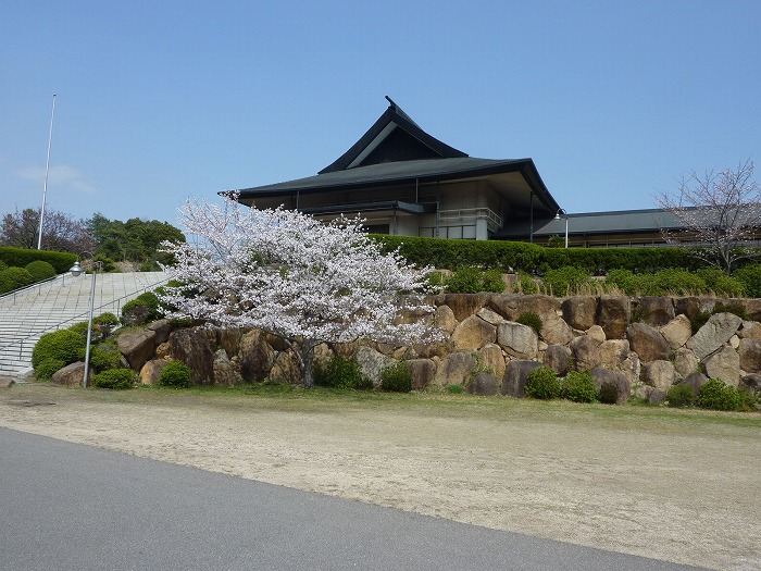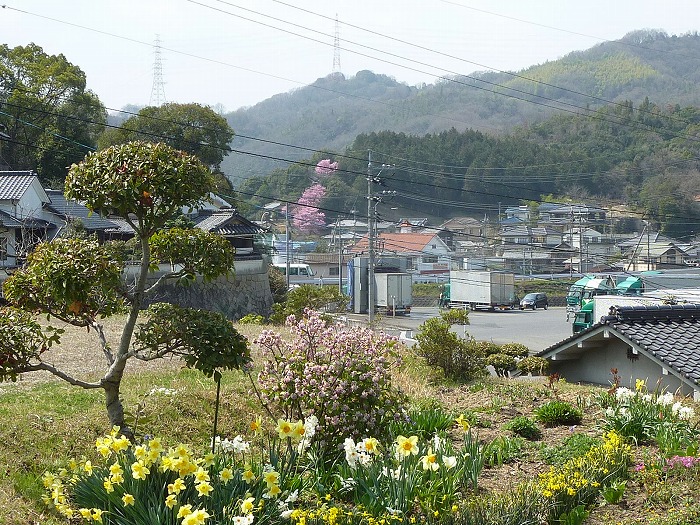 天理教から出て、県道井原福山港線から天理教の桜を見る。