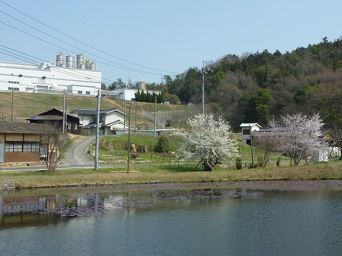 用之江の池迫池。うしろの工場は食品トレー容器で有名な「エフピコ」。