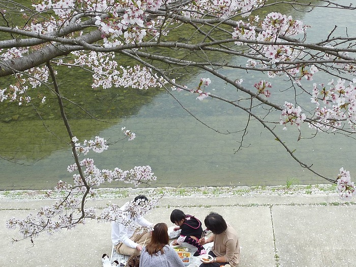 上から散った花びらを受けながらの贅沢な弁当を楽しむ家族。