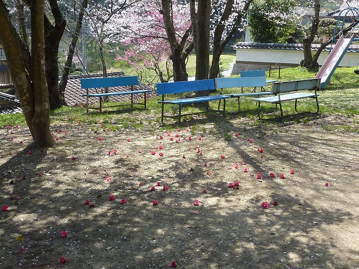 石段に散った椿と桜。