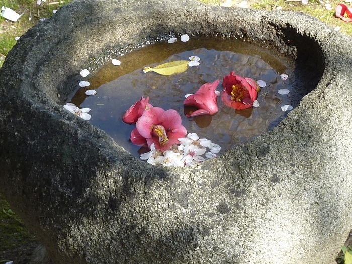 鉢にも椿と桜の花びら。