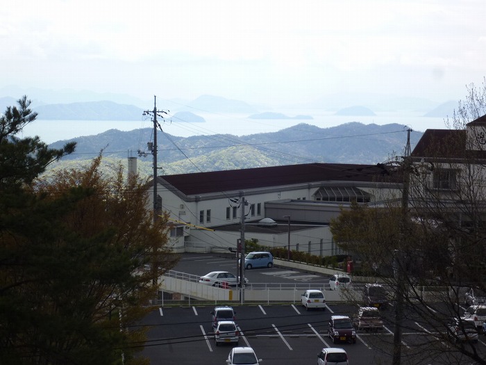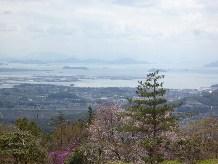 展望台から見る四国本土の紫雲出山、左右に佐柳島・真鍋島。