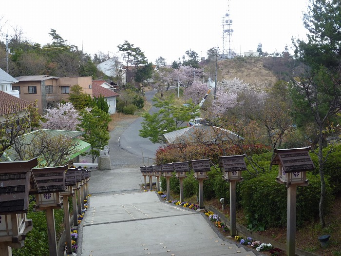 横断する山陽本線。やや左に青い屋根の金光教本部。