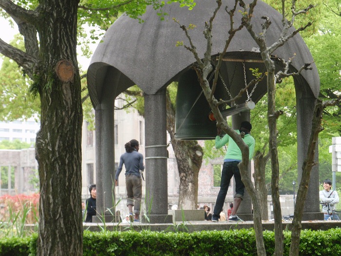 「平和の鐘」を突く黒人男性。