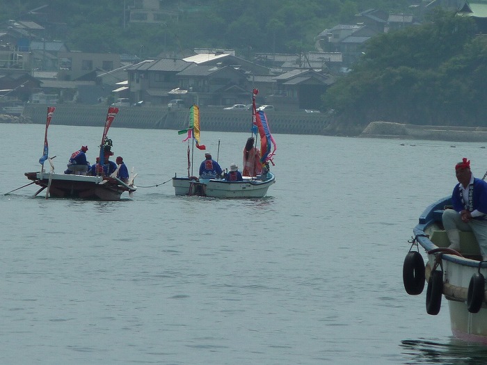 弁財天に祈願中、海で待つ観光鯛網船団。