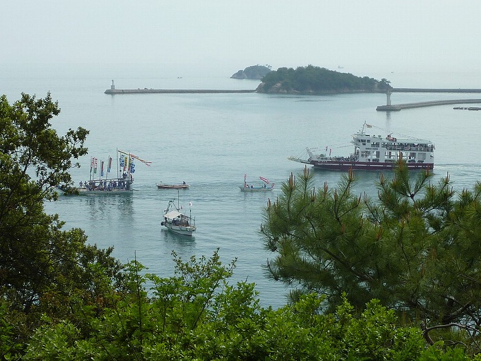皇后島の前、弁天島へと向かう観光鯛網船団。