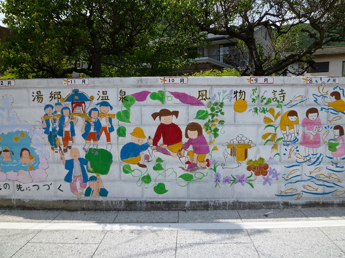 通りの塀には湯郷の四季、6月には蛍でも有名なそうだ。