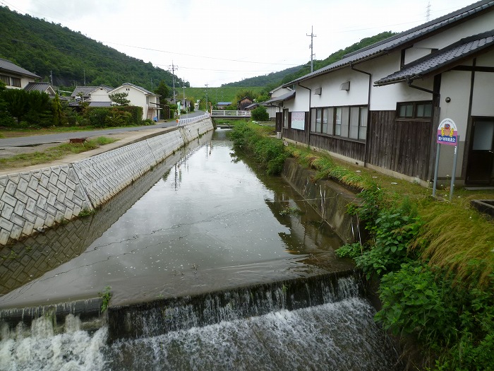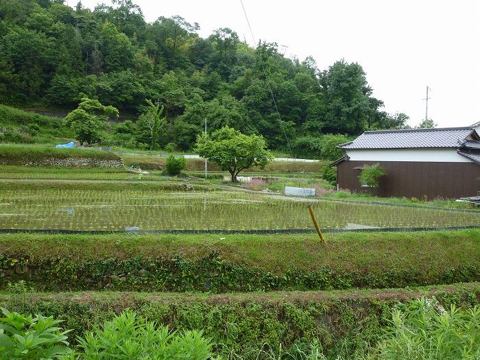 旧松山街道の常夜灯と田植えが終わった田んぼ。