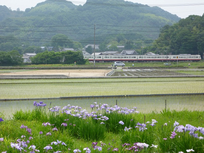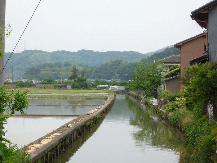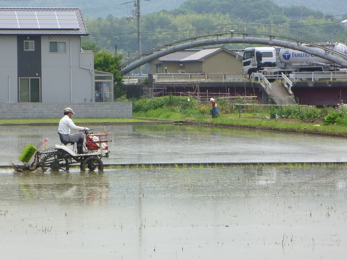 用之江川の橋の上は人や車や田植え機や耕耘機あり。まさに6月。