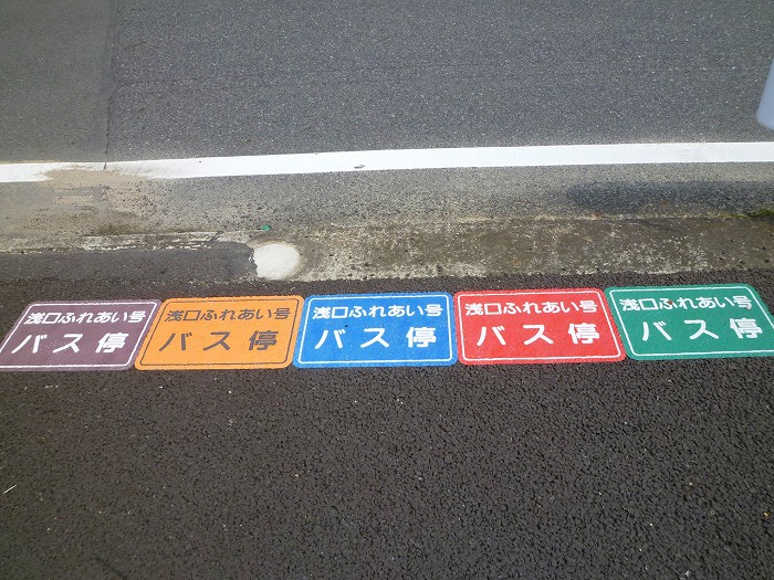 「浅口ふれあい号」のバス停。路面に↓バス停表示があるだけ。