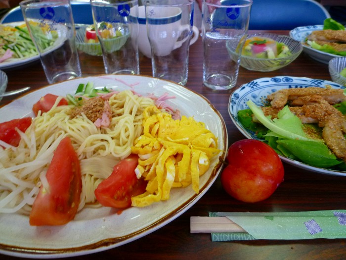 冷やし中華に盛り付けをする。