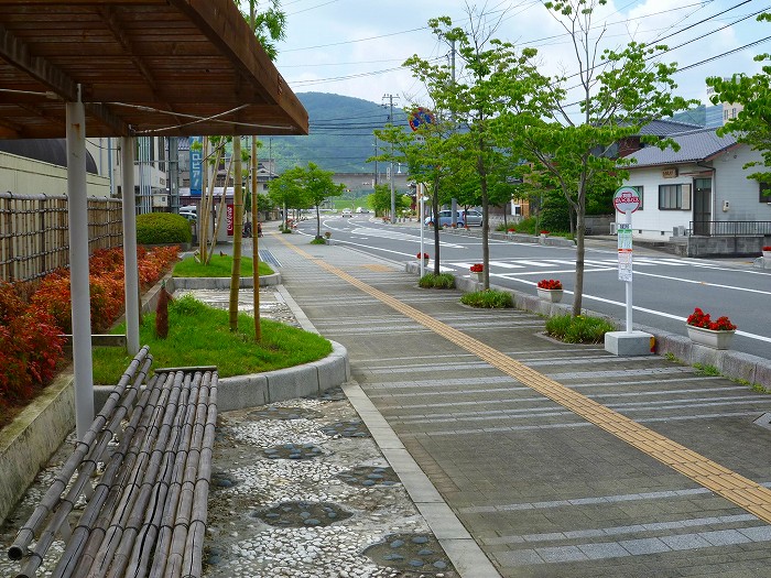 乗合バスの停留所のイスも竹製、珍しいな。その向こうには竹と竹の子が見える。