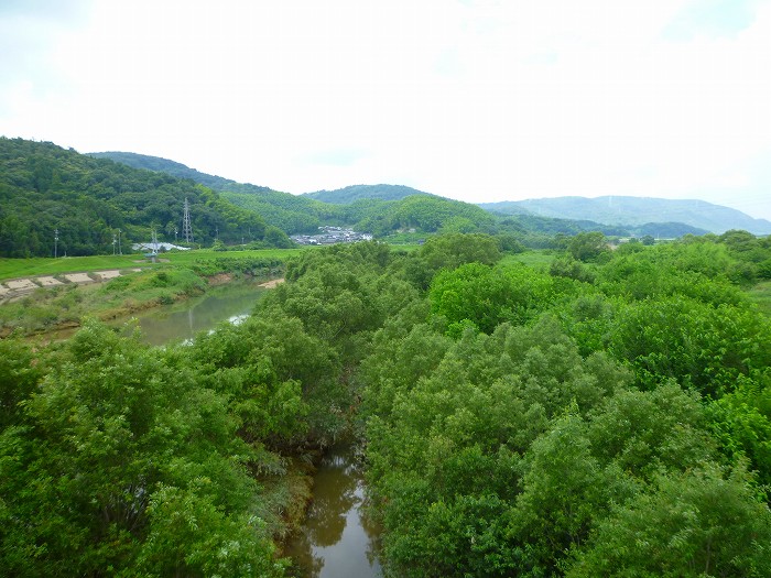 土手の上から見る真備町の駅や支所方面。