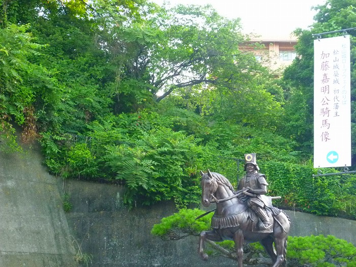 賤ヶ岳七本槍の加藤嘉明の騎馬像が、登山口の横に出来ている。ここより松山城に登る。