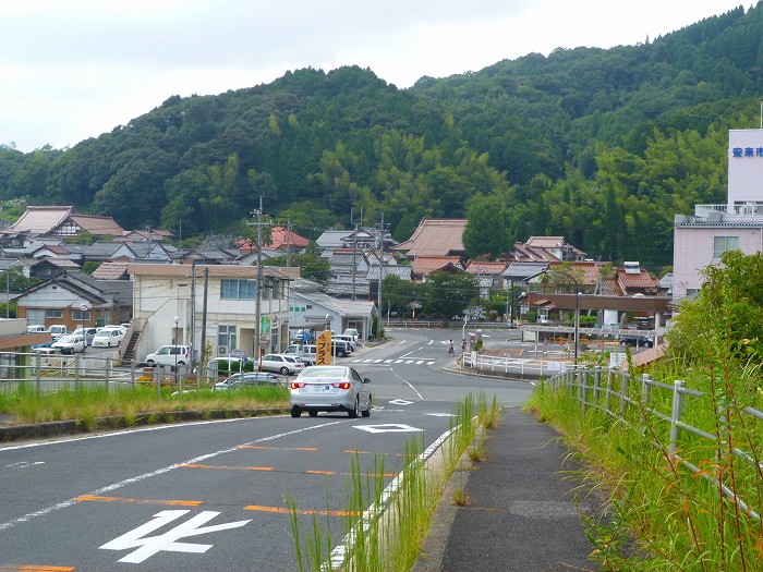 飯梨川を渡ると右に安来市民病院、左に市街地がつづく。市街地の後ろにはお寺が並ぶ。