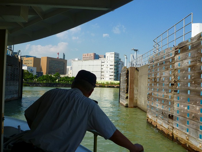 船は水門の中に入り、船員さんは港に着く準備をする。