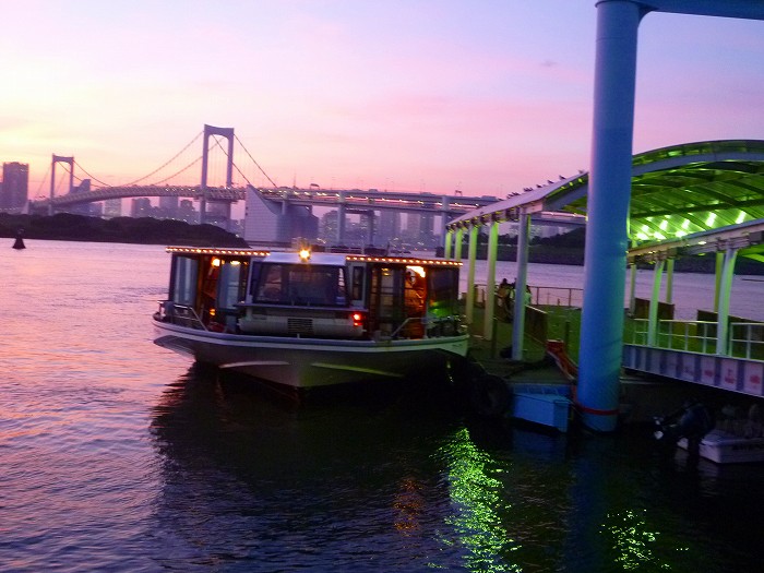 この船が日の出桟橋との定期船。「本日の最終便です」と案内中。