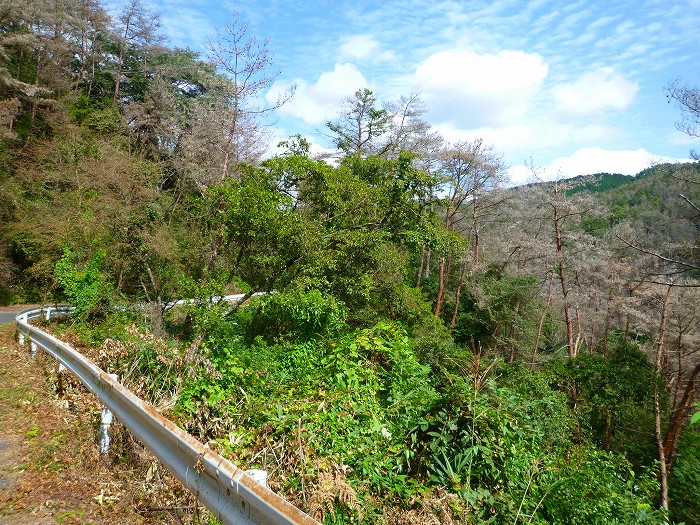 えいちゃんが歩く車道の左右にまで松枯れがひろがっている。