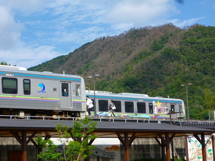 手前が下りで「神辺行」、右が上りで「総社行」。