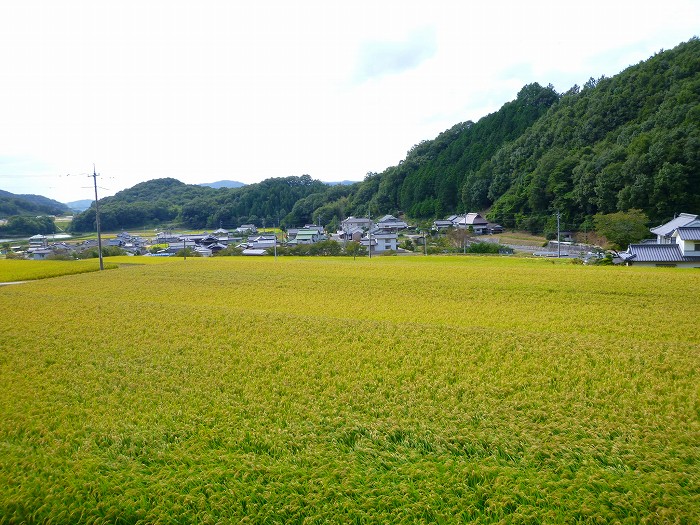 稲刈り前の田んぼと山と民家があり、大谷川という小さな川が流れている。