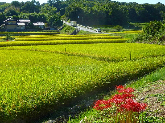 稲穂にコスモスや彼岸花が、更に色を加えてこれ以上ない秋の景色になっている。