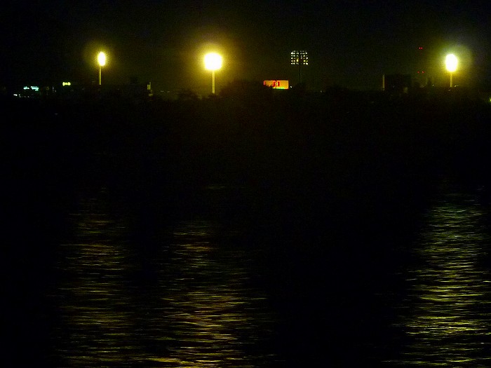 九番町の「笠岡運動公園」の野球場のライトが海に映る。