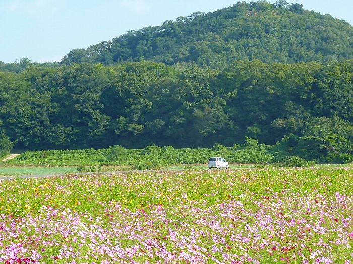 この展望台↑の、右手の神島側が早くから咲いているコスモス。