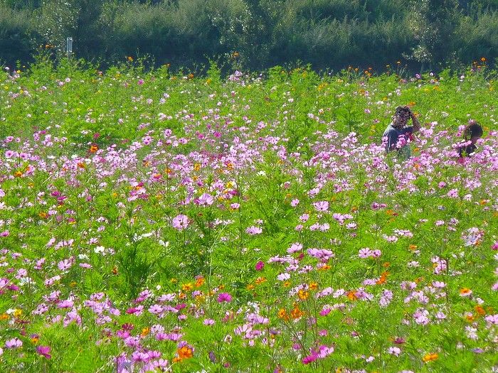 コスモス畑を歩く人。
