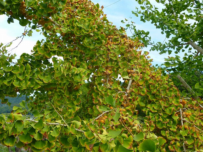 枝のまた枝が銀杏の重みに耐えられず折れる寸前。