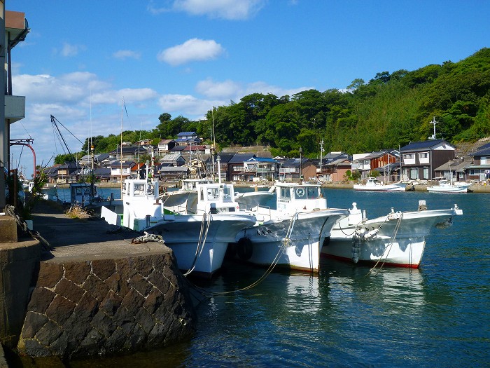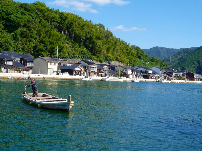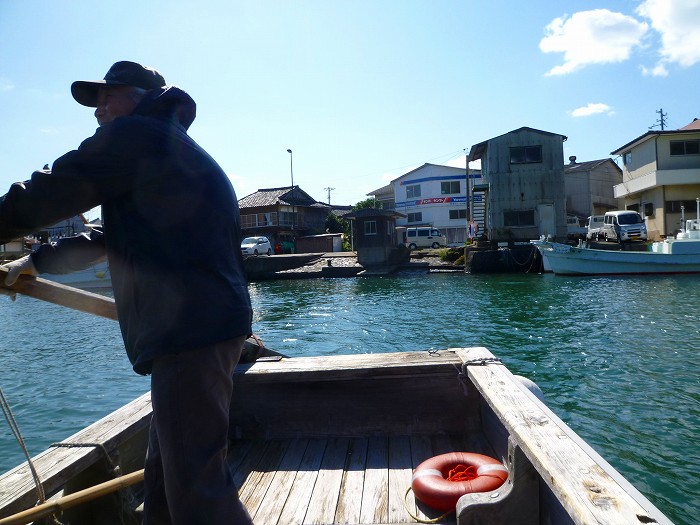 「今時、船外機すらつかない船はないなあ」とのんびりと櫓を漕ぐ。