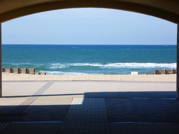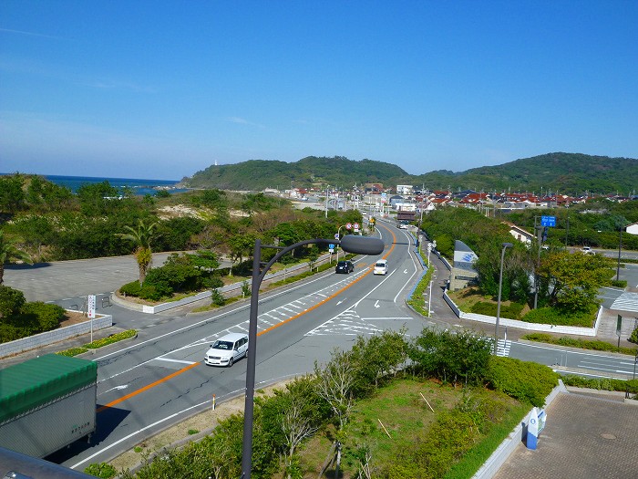 大きな歩道橋があり、駐車場と国道9号線をまたいでいる。