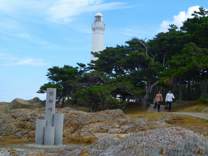岩場から灯台を見上げる。