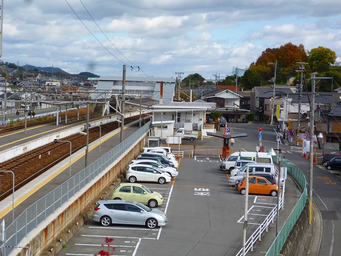 写真中央に山陽本線、茶色の建物は「仁科記念館」。