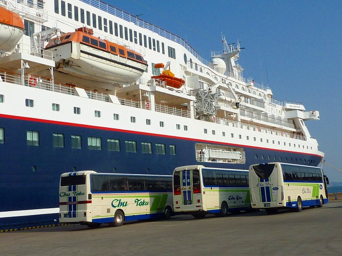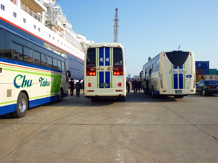 埠頭には大型観光バスが3台待機。