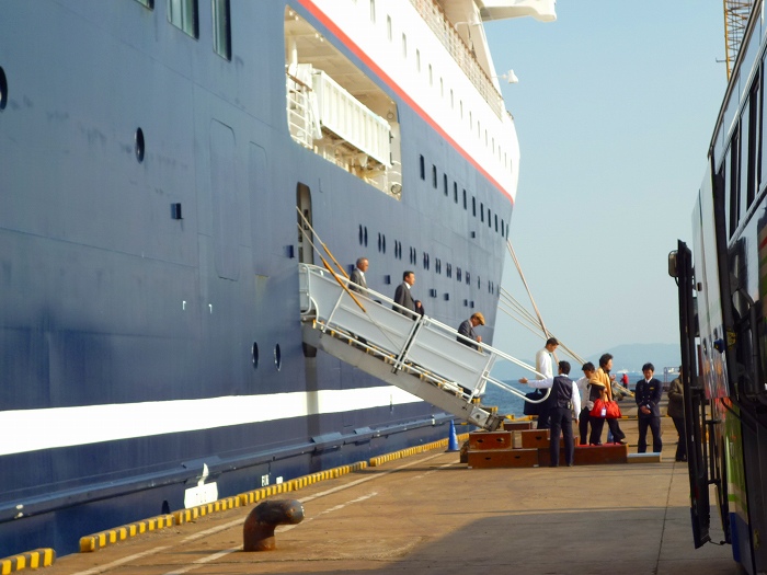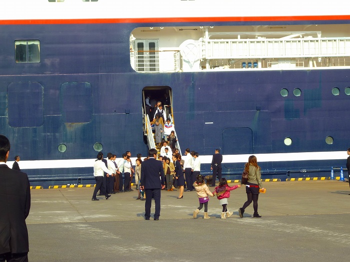 ほとんどの人が、下船した後、一度船を見上げる(見返る)。