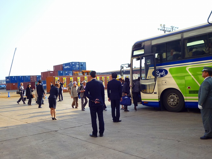 バスへ乗る人。(ツアーのバスと、福山駅行きバスとの2種類)