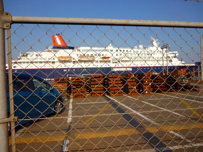 箕島とタラップ前の鋼材。豪華「サンタクルーズ」という名とは対局の風景が広がる。