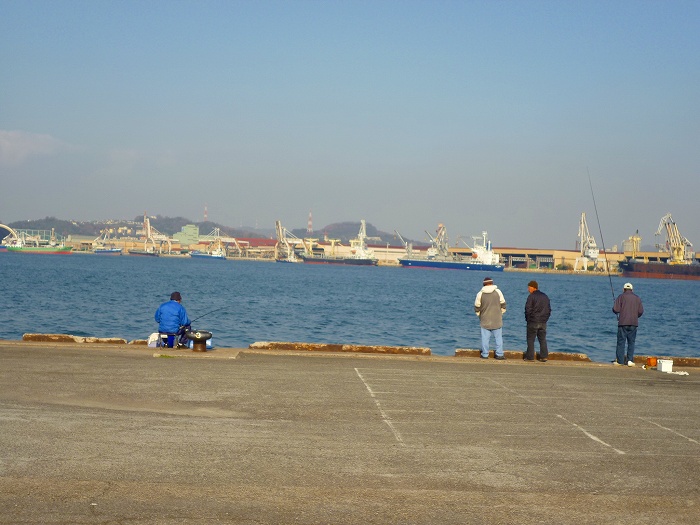 定期船が無くなった福山港の旅客岸壁。ここには釣り人など10人くらい。