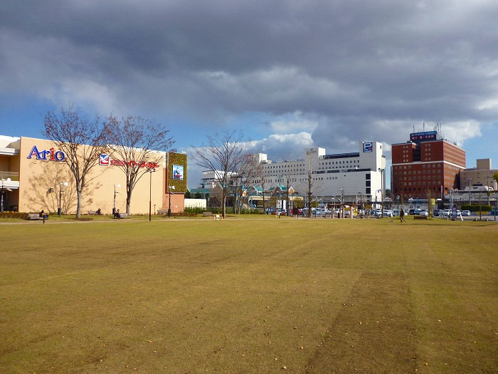みらい公園とアリオ、向う側には倉敷駅ビルと西ビル(アパホテル)。