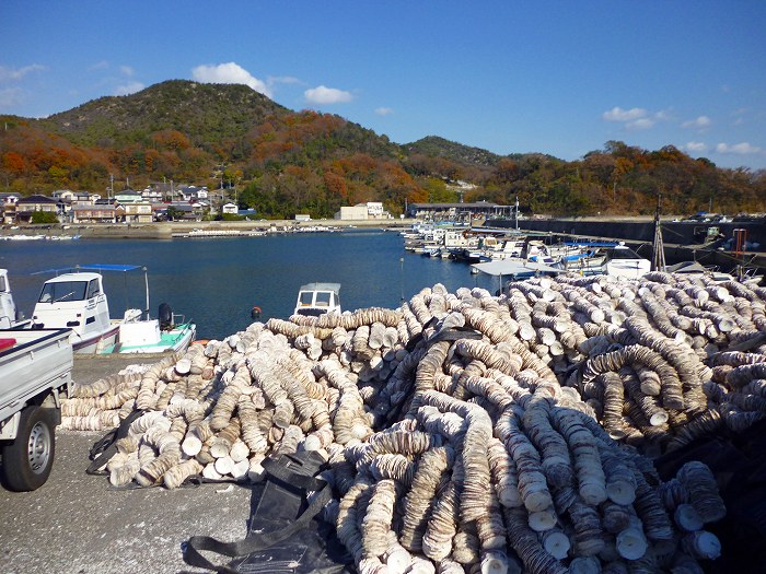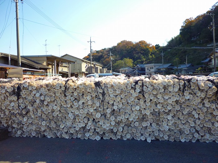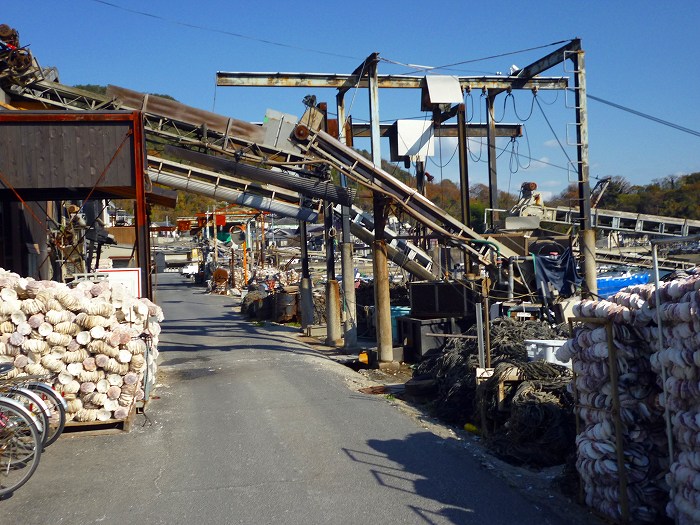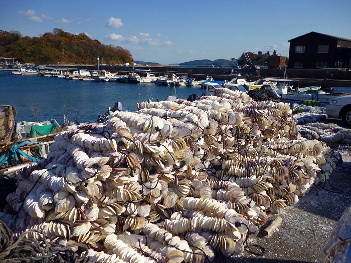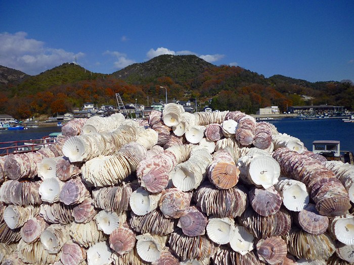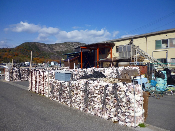 入江になった虫明漁港にはホタテ貝が山になっている。