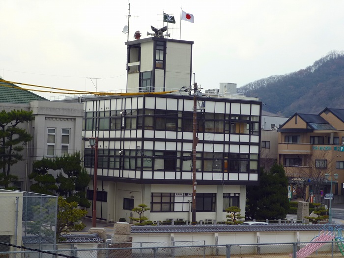 陣屋稲荷の石段から見る笠岡市役所と議事堂。