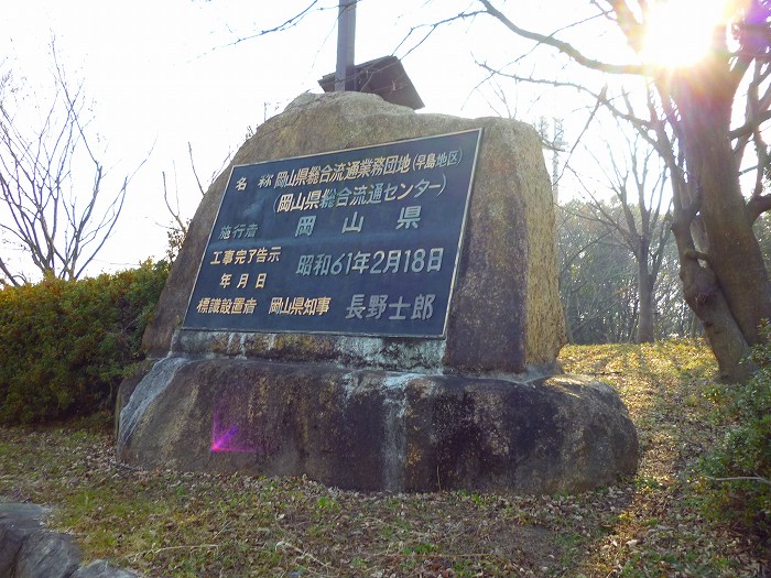 その早島・岡山の真ん中地点に「設置者 岡山県知事 長野士郎」の石碑。